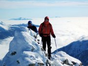 Na sněžnicích i s podporou trekových hůlek to řádně podkluzovalo a nevím, jestli by tento závěrečný úsek nebylo lepší vystoupat v mačkách. V sedle jsme se do nich už přezuli, protože na hřebenu bylo více ledu než sněhu a sněžnice by byly trochu nebezpečné. Hřebínek byl místy úzký a stačilo udělat dva kroky vedle a neštěstí je na světě. Po dvaceti minutách jsme se dostali na vrchol Gr. Bösensteinu, kde nás čekal vrcholový kříž s nádherným panoramatickým rozhledem po celém okolí, za kýčovitého inverzního počasí. Krásně bylo rozeznat od západu na východ postupně masiv Dachsteinu, Totes Gebirge s nejvyšším vrcholem Gr. Priel a Hochtor. Na jihu se vedle nás týčil Kleine Bösenstein, kam mířili všichni skialpinisté, protože zde byla možnost sjet žleb až z vrcholu na lyžích. Silný vítr nám nedovolil delší setrvání na hřebenu, tak jsme se rychle pokochali a vše zaznamenali do našich zrcadlovek. Rychle jsme sestoupili do údolí mezi Bösensteiny, kde jsme v klidu doplnili energii a vypili vrcholovku – třídecové šampáňo v pěti lidech. Něžná půlka výpravy odtud odešla mírně vyčerpaná po stejné trase směr Edelrautehütte.